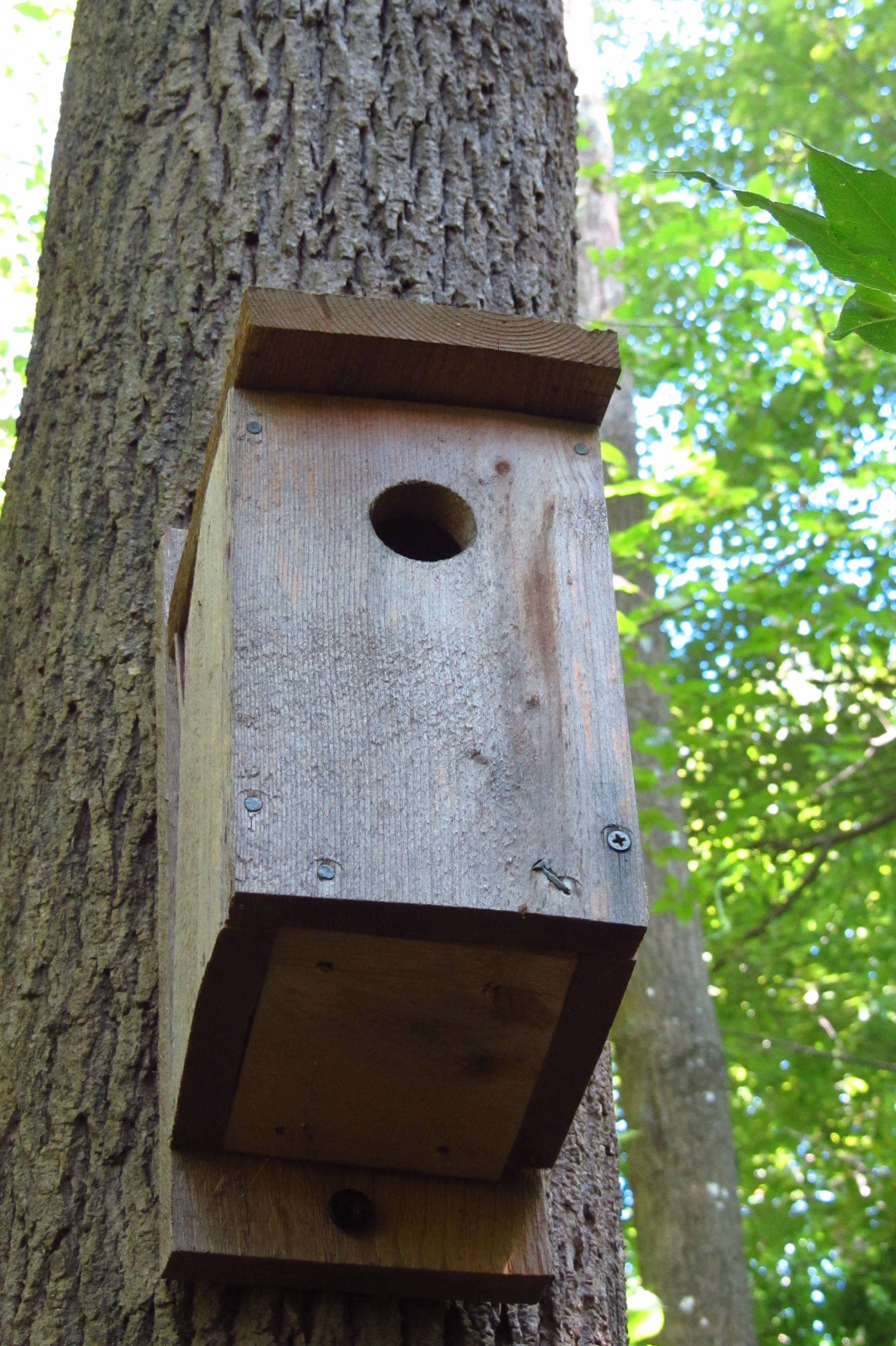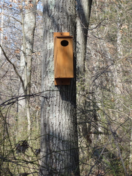 BirdhousesThere are two kinds of birdhouses along this trail. Some are for wood ducks and others are for songbirds.Birdhouses are built differently depending on the type of bird they hope to attract. The wood duck houses are larger and the holes in them are large and oval. The hole diameter is about 4 inches. These boxes are tall and proportionally narrow, and they are found close to the river. There is one located on the river side of the trail, between the Blueberry marker and the Oak marker. Songbird houses have smaller, circular openings. The openings in these boxes are only 1 1/2 inches in diameter. The boxes have a shape more closely rembling a cube. They are located slightly farther away from the river than the wood duck houses. You can see a songbird house on the left side of the trail just past the Jack-in-the-pulpit marker. |