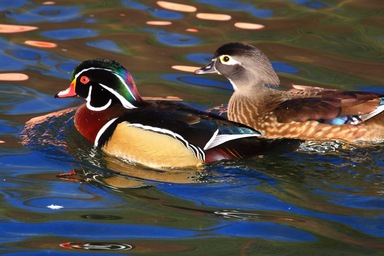 Wood DucksWood ducks (Aix sponsa) are brightly colored birds. The male has a dark, often green, head with white stripes down the neck and strikingly red eyes. The female is brown and has a white oval around her eyes. They are medium-sized ducks, about 50 cm (20 inches) long. Their make their nests in trees in the wetlands along both coasts of North America. The elevated nest site offers protection from predators.During the 19th century wood duck feathers were in high demand for decorating ladies's hats. The ducks were overhunted. As wetlands were destroyed, they also lost a large number of their nesting sites. Their numbers decreased and they were almost wiped out by the beginning of the 20th century. Laws were passed limiting how many ducks each person may hunt. In the 1930s people began putting up bird houses for wood ducks. Their population has increased despite the fact that they are still the second most hunted duck in North America. The mallard is the most hunted. |