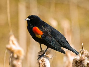 Red winged blackbirdRed winged blackbird (Agelaius phoeniceus) is a common songbird throughout North America. It is sexually dimorphic (males and females look very different). The male is almost all black, with bright red shoulders and a yellow bar just below the red. Females are brown with a white stripe just above and behind the eye. Red winged blackbirds eat seeds and insects. |