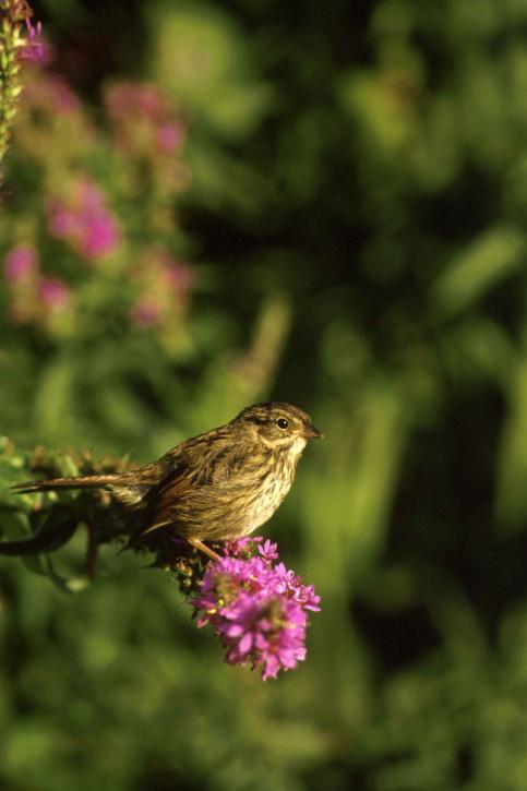 Swamp sparrowThe swamp sparrow (Melospiza georgiana) has a reddish brown back and grey breast and face. Males and some females are also reddish brown on top of the head. They have a dark stripe just behind the eye. They live in wetlands in eastern and central North America and eat mostly insects and some seeds. They have long legs because they forage for food in the mud near rivers or marshes. Their numbers have declined due to loss of wetlands. | Swamp sparrow by John and Karen Hollingsworth, U.S. Fish and Wildlife Service | |