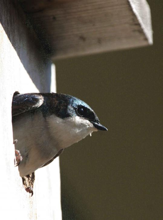 Tree swallowThe male tree swallow (Tachycineta bicolor) is shiny blue or blue-green on its back and head. The female is slightly less vivid colored, more greenish than the male. They are both white underneath. The tree swallow has a small beak. Its tail is slightly forked. They live near water and eat mostly insects and some fruit. | Tree swallow profile in nest box by Donna Dewhurst, U.S. Fish and Wildlife Service | Tree swallow by James C. Leupold, U.S. Fish and Wildlife Service |
