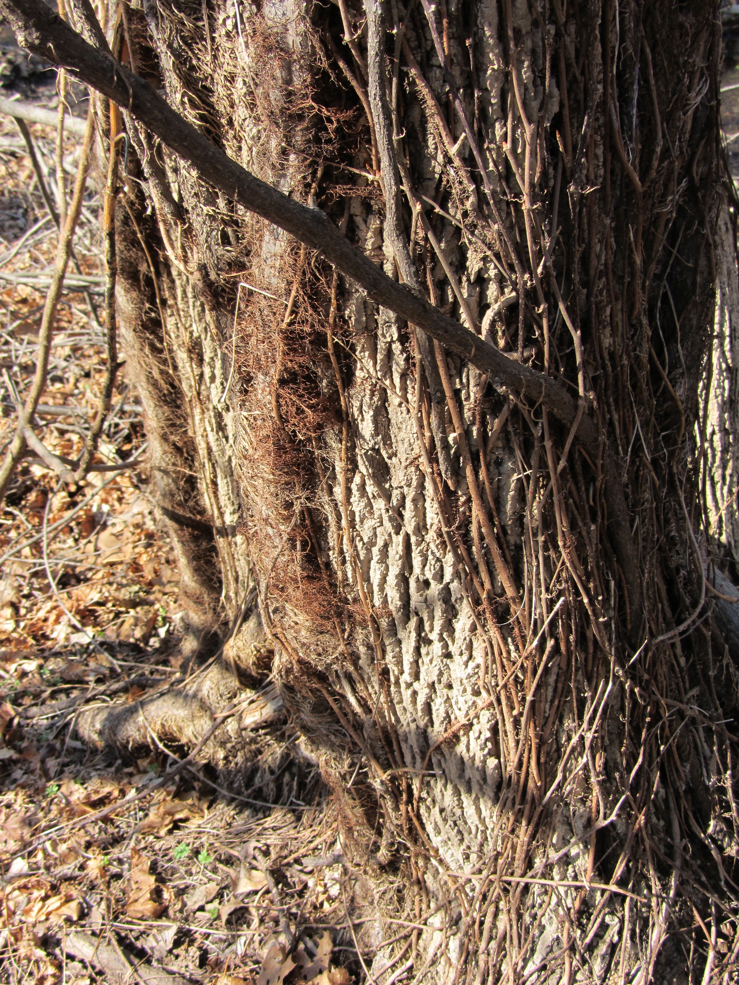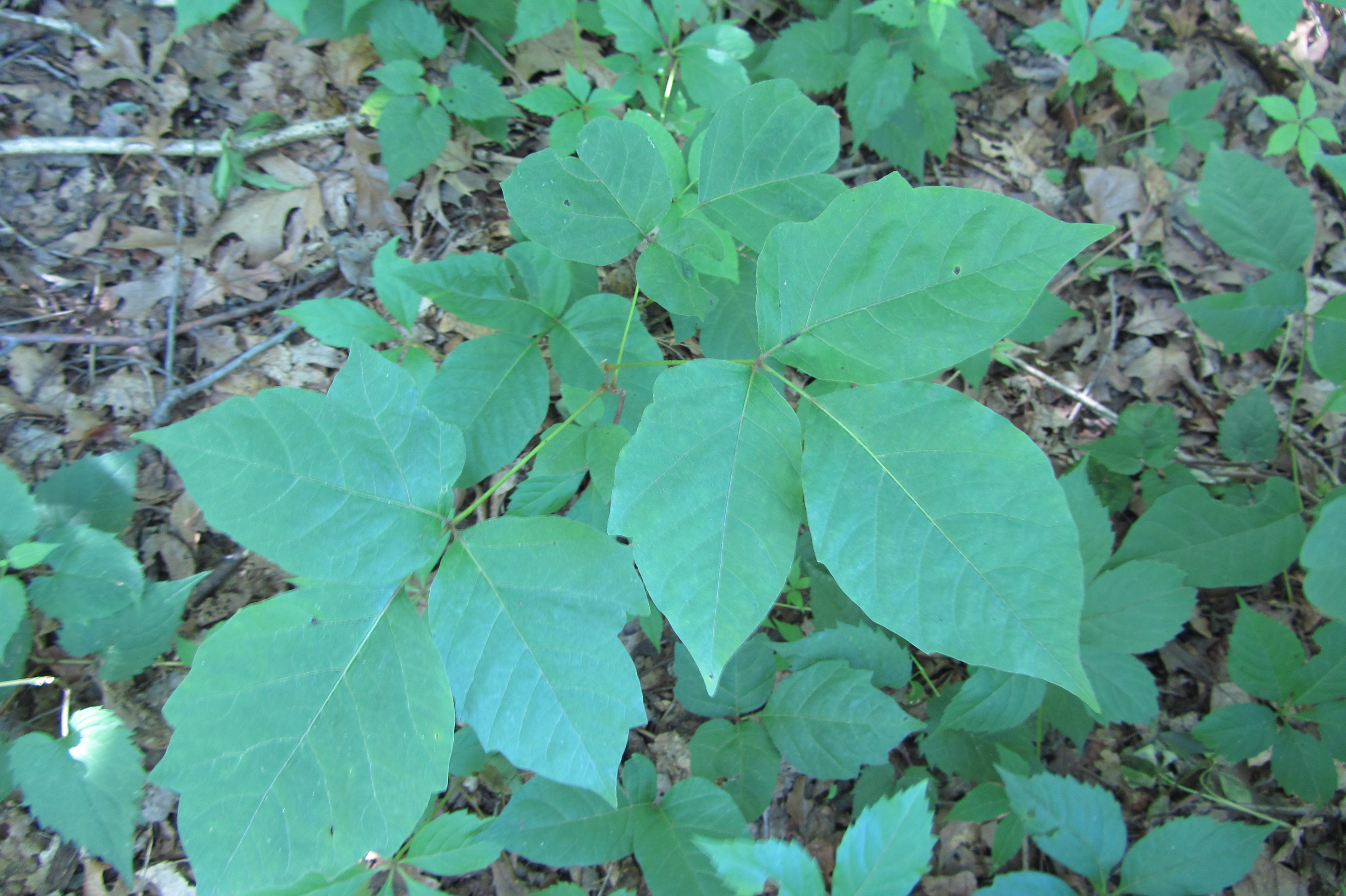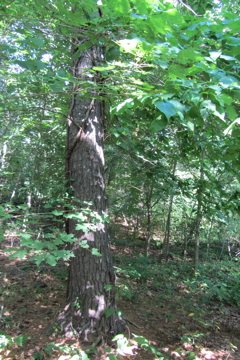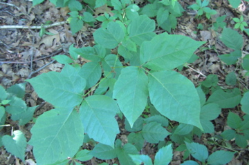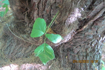In front of you is a tree that appears to have oval leaves about 6 inches long. It looks like it is deciduous -- that means a tree that will lose its leaves in the fall. But no, this tree has needles. It is a white pine with poison ivy growing up its trunk. If you see a plant with leaves growing in bunches of 3, it may be poison ivy. Don't touch it! Poison ivy can cause a terrible rash in people. Poison ivy grows many ways. It can grow as short as only a few inches high along the ground, or it can climb 15 feet high by clinging to a tree. See the roots growing up the trunk of a large tree? Don't touch the roots, not even in winter. Click here to read about white pine trees |