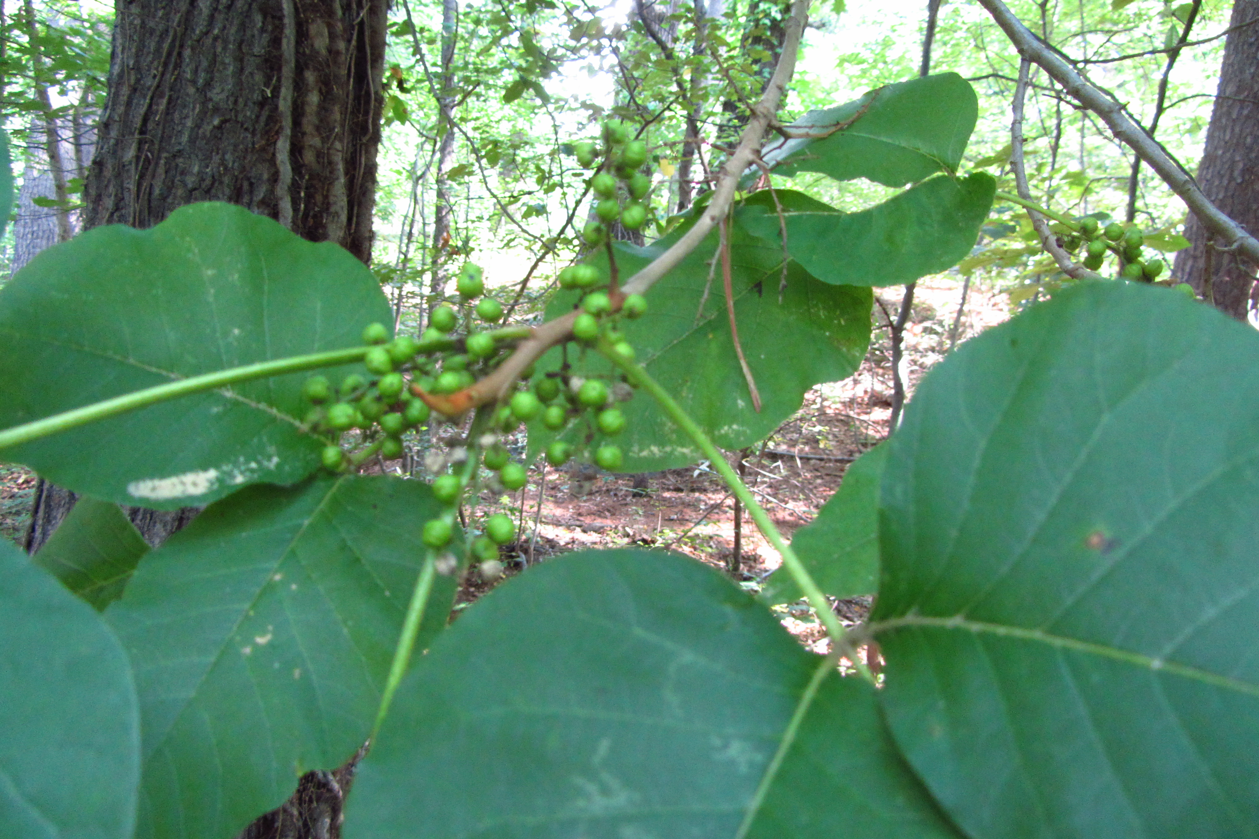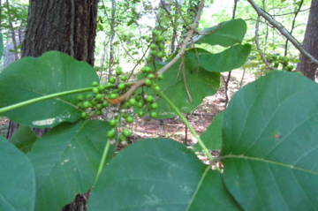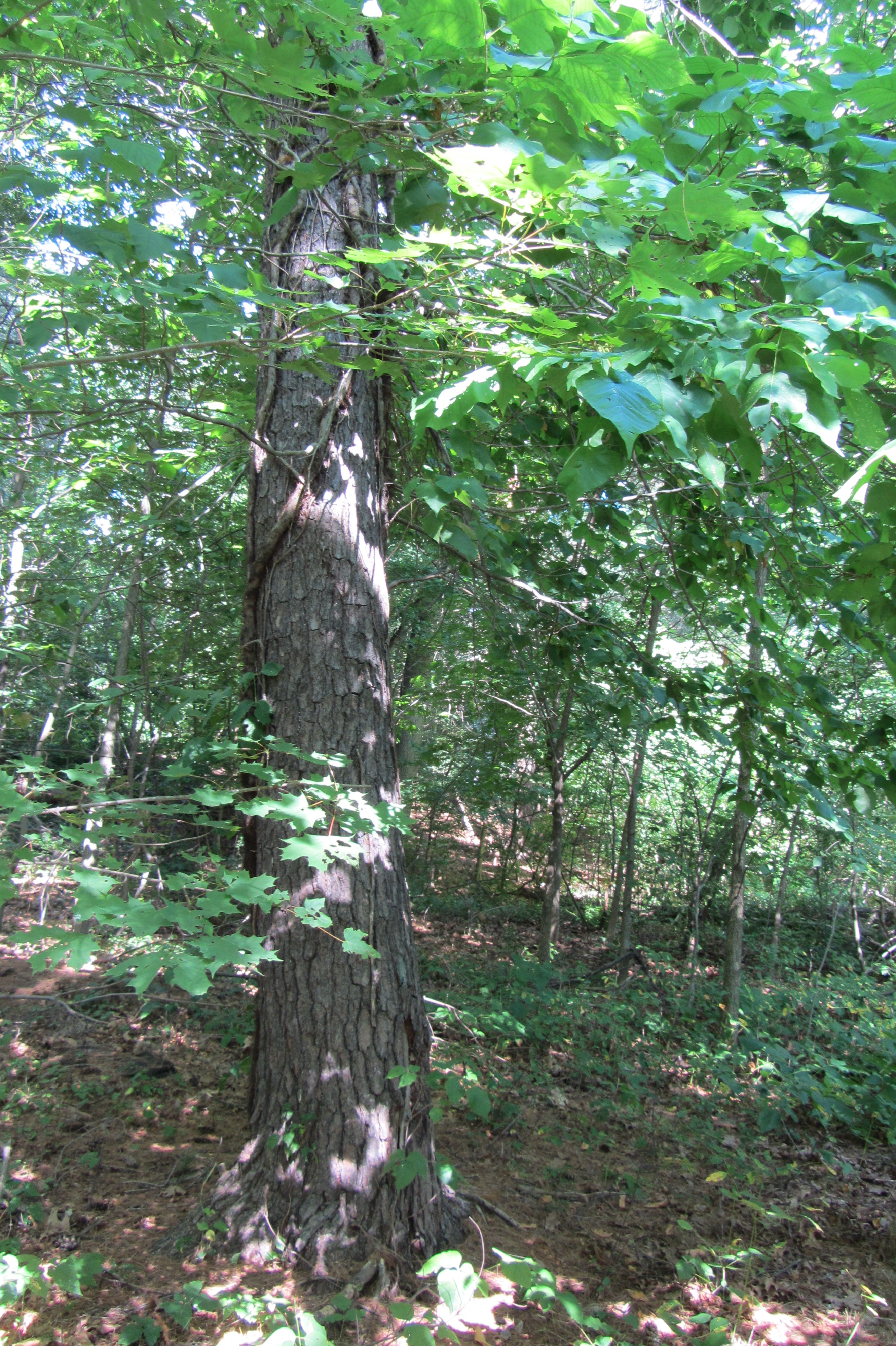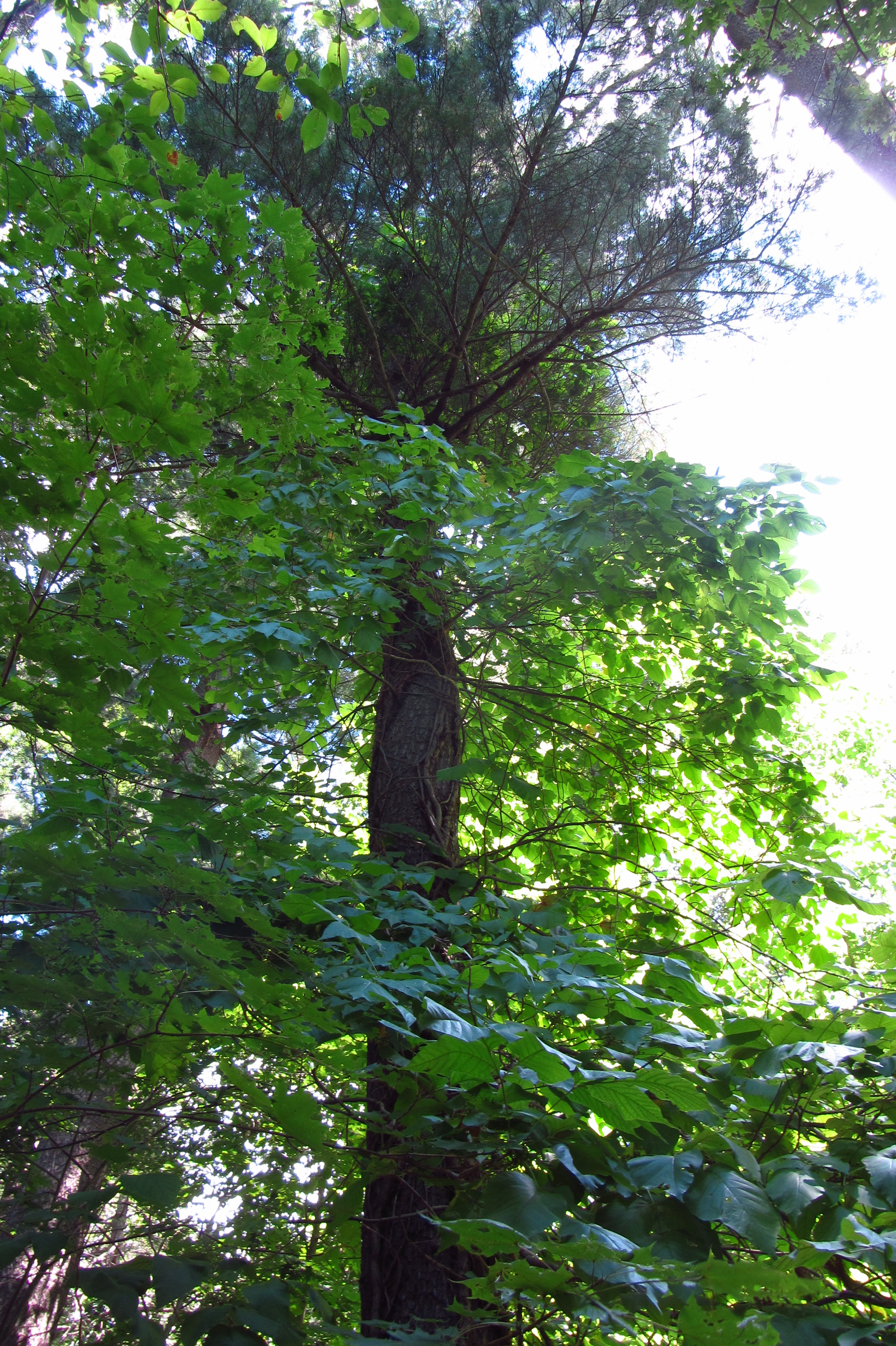 In front of you is a tree that appears to have oval leaves about 6 inches long. It looks like it is deciduous -- that means a tree that will lose its leaves in the fall. But no, this tree has needles. It is a white pine with poison ivy growing up its trunk. If you see a plant with leaves growing in bunches of 3, it may be poison ivy. Don't touch it! Poison ivy can cause a terrible rash in people. Poison ivy grows many ways. It can grow as short as only a few inches high along the ground, or it can climb 15 feet high by clinging to a tree. See the roots growing up the trunk of a large tree? Don't touch the roots, not even in winter. Click here to read about white pine trees |