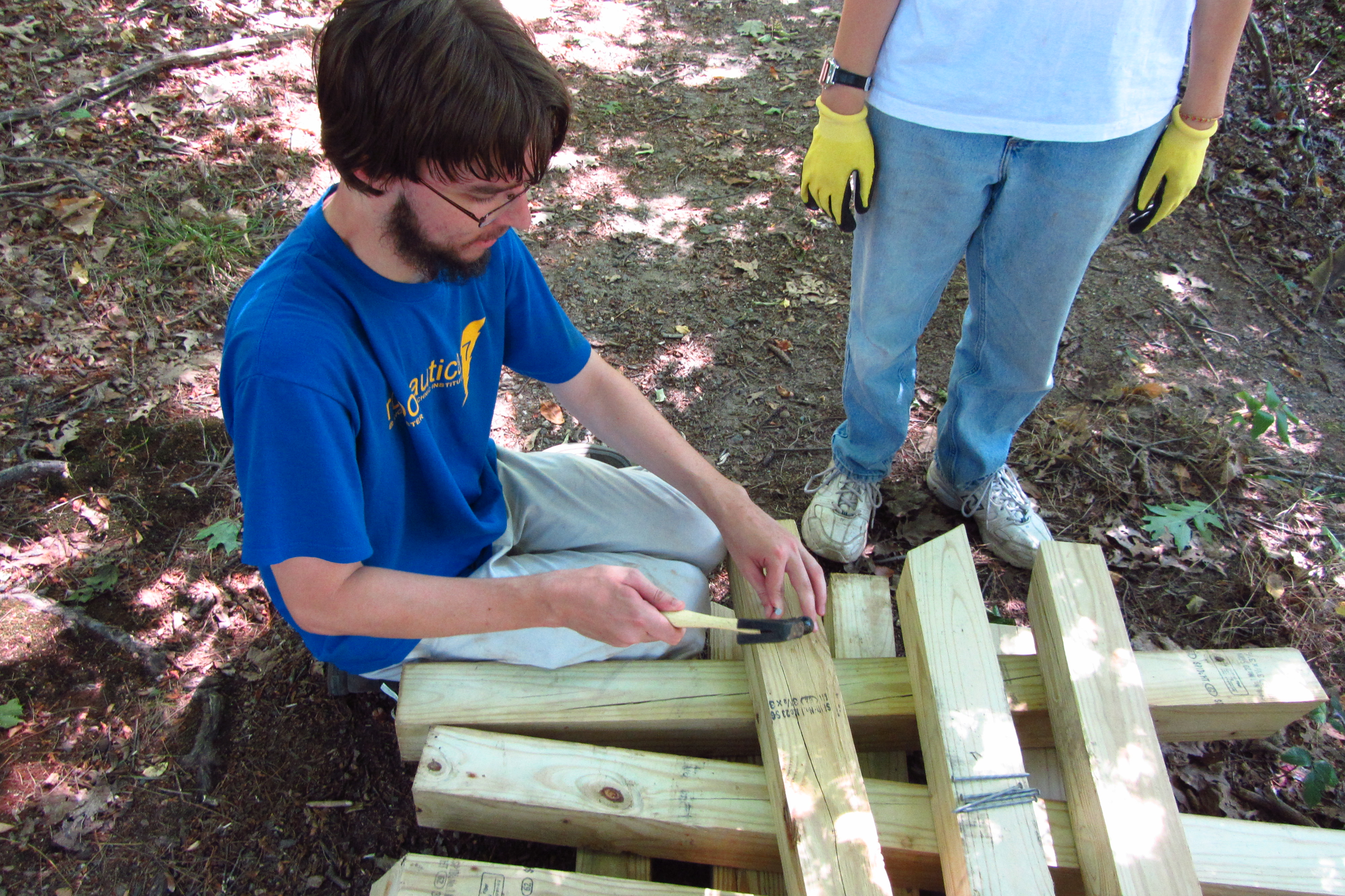 Jeremy pounding nails into the bottoms of the posts Nails help keep posts from shifting |