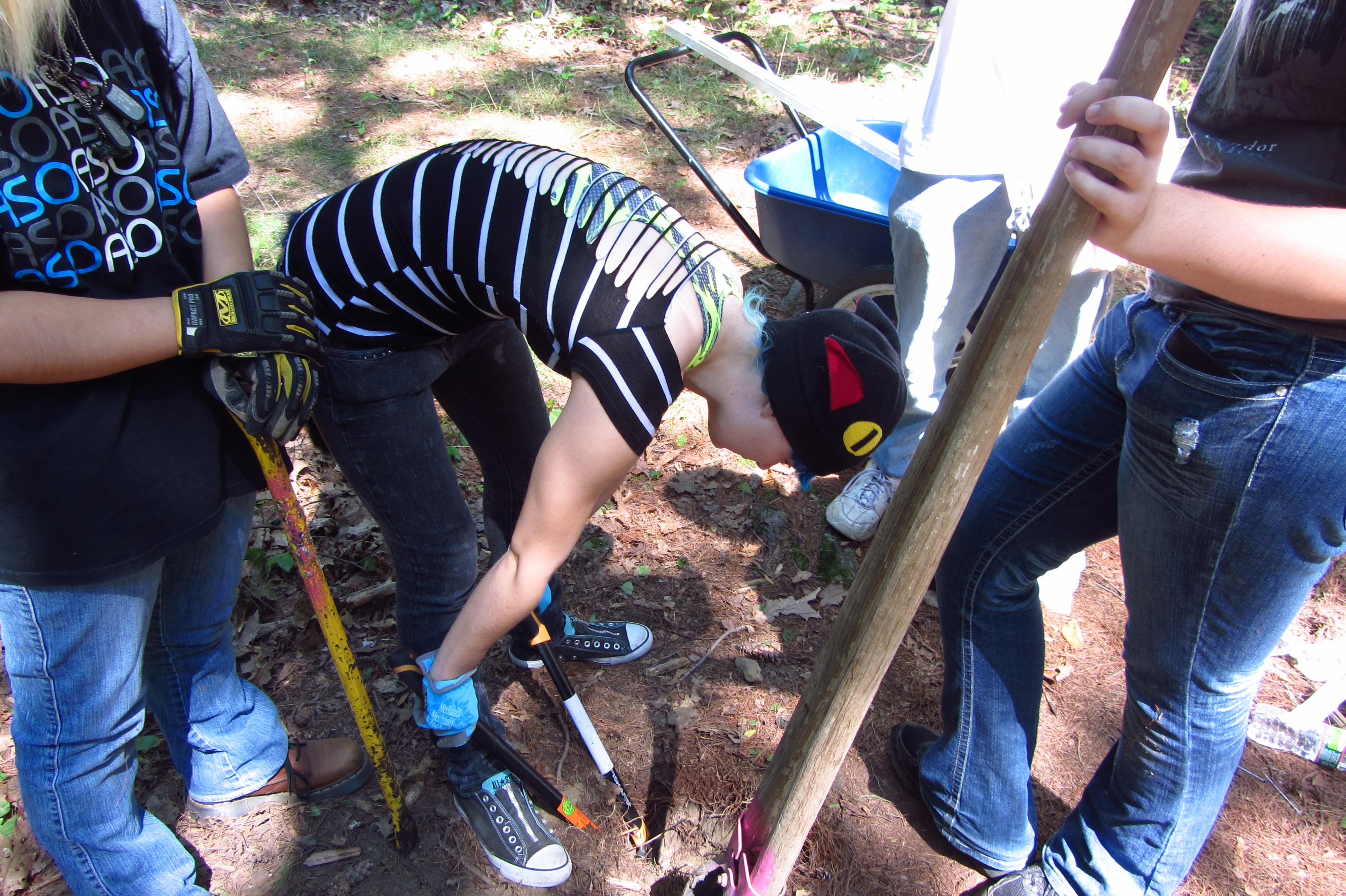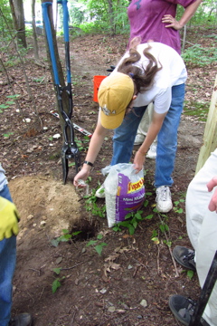 Melissa putting gravel in the hole for drainage |